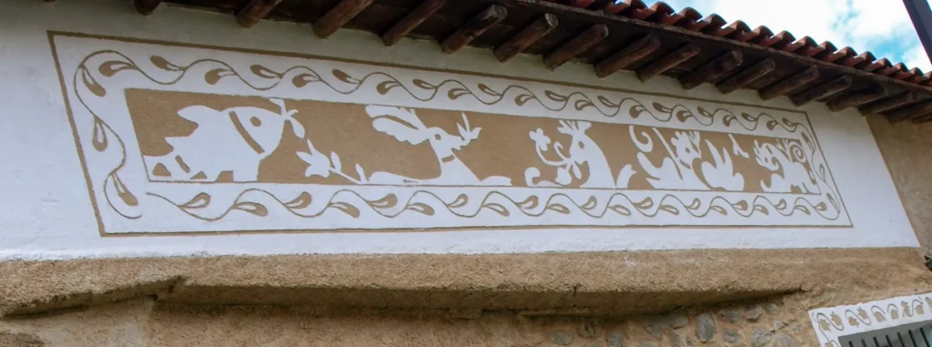Con una pretensión decorativa y en ocasiones para proteger los muros exteriores, algunas fachadas muestran la técnica del esgrafiado, que consiste en aplicar un revestimiento formado por varias capas de distintos colores sobre el que se dibujan, mediante incisiones, diversas cenefas geométricas, imitaciones de sillares y ladrillos o motivos de fauna y flora habituales en los diseños textiles serranos.