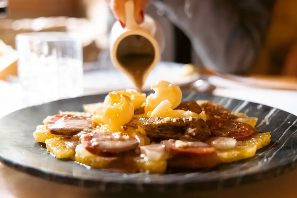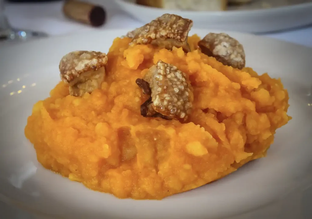 Un plato que constata a la perfección, que las recetas elaboradas con ingredientes humildes pueden convertirse en verdaderas delicatesen. Cocinadas de forma muy lenta y trabajadas a mano, con paciencia y esmero hasta obtener una crema espesa que envuelve y acaricia el paladar, gracias al aderezo compuesto por ajo, pimentón, comino y la propia esencia de los torreznos, que se servirán al final como complemento, crujientes y plenos de sabor.