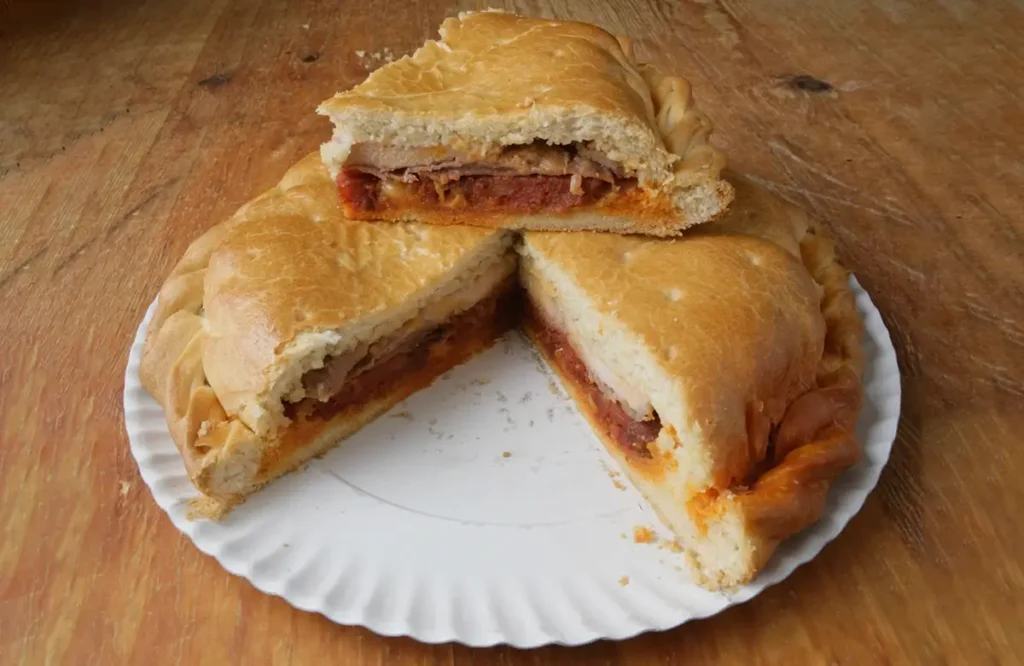 El Hornazo salmantino de la Sierra de Francia se elabora mayoritariamente en formato redondo y se rellena con diferentes embutidos y cortes del cerdo -chorizo y lomo principalmente-, además de huevo cocido.